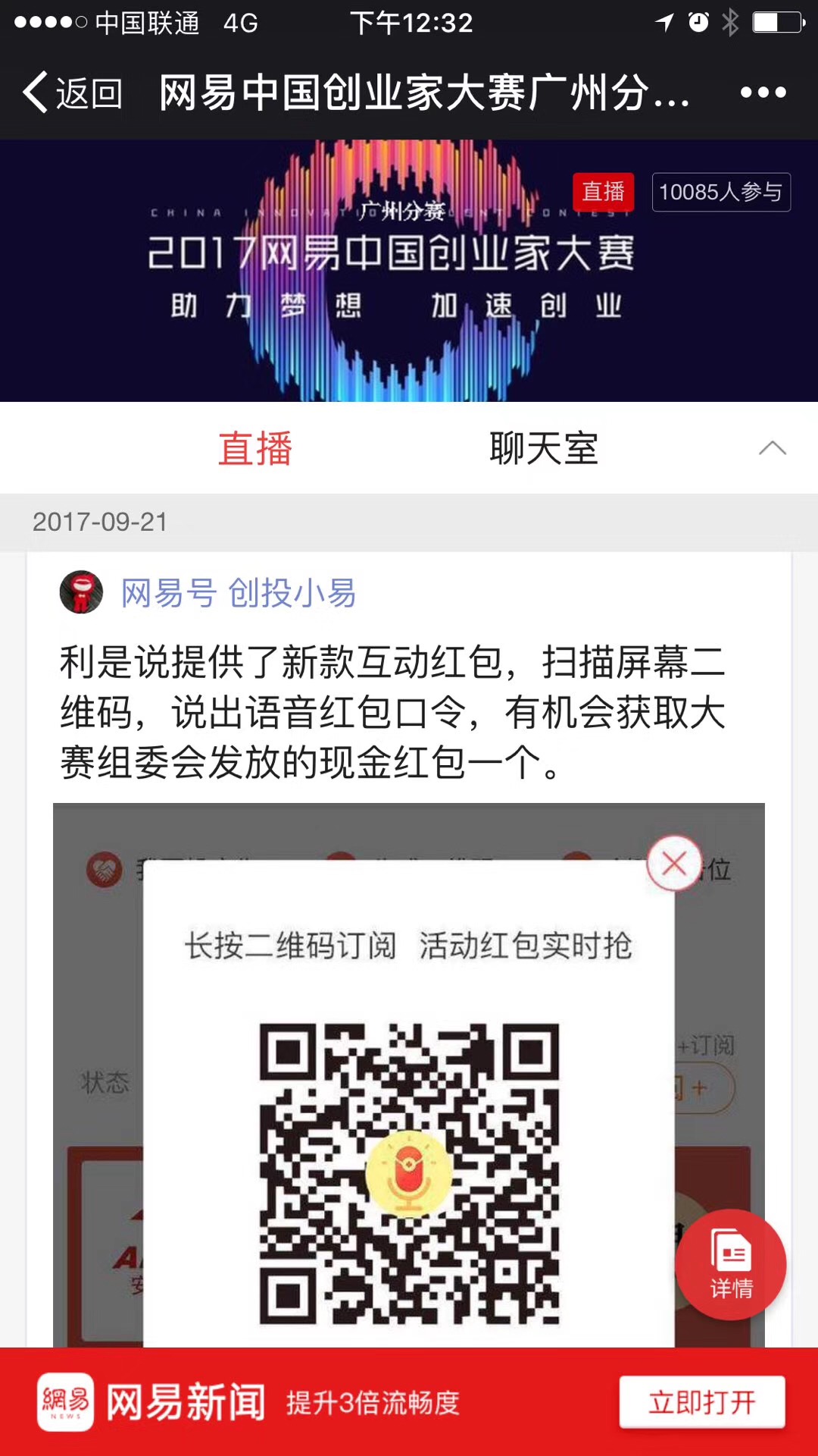 随后进入有趣的互动环节,大屏幕上出现了一个二维码,扫码有惊喜,原来是语音口令红包,按下语音键念出“祝大赛圆满成功!”即可有机会领取本次大赛组委会送出的现金红包一个。现场异口同声说出"祝大赛圆满成功"。